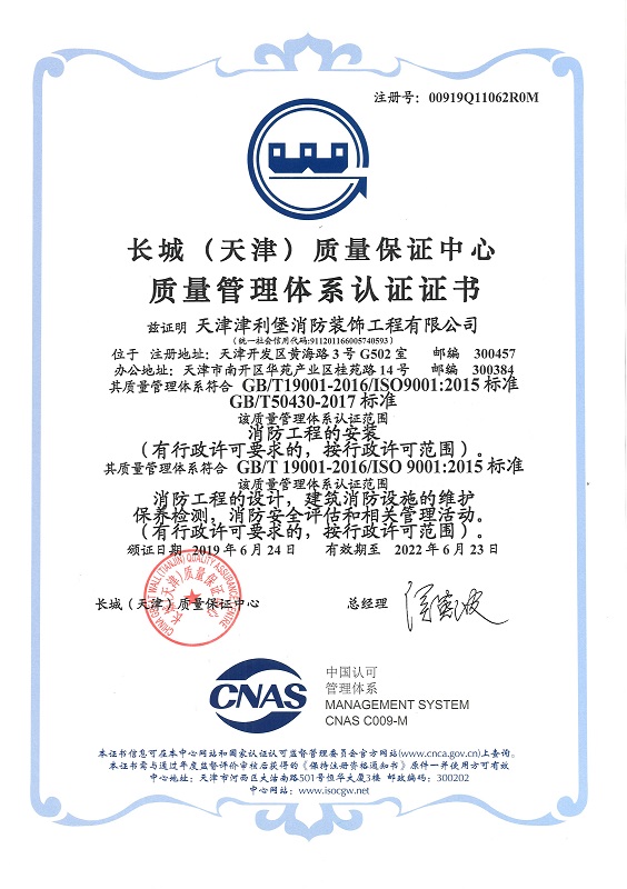 津利堡公司于2000年04月通過了適用于消防工程的設計、安裝及服務的質量管理體系認證(GB/T19001 idt ISO9001)。為適應市場的發展,促進公司在職業健康安全和環境方面管理水平的提高,進一步增強公司的市場競爭能力,津利堡公司于2004年09月通過了職業健康安全和環境管理體系認證(GB/T28001 idt OHSAS18001和 GB/T24001 idt ISO14001)。隨著公司的發展,并為了適應市場的要求,公司于2012年開始依據《工程建設施工企業質量管理規范》(GB/T50430)的要求重新整合公司的質量、職業健康安全和環境一體化管理體系,將“顧客的需求”、“以人為本、保護員工健康安全”、“節能降耗、保護環境”作為公司關注的焦點,以“共創安全、共享發展”為公司宗旨,注重員工在質量、職業健康安全和環境方面的素質和意識的培養,進一步提高了公司的一體化管理水平。